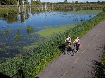 Ainsi, 4 km de piste cyclable ont été raccordés à un réseau de 70 km. Ce circuit passe sur les terres d’Hydro-Québec et longe des terres agricoles ainsi que les magnifiques bassins aménagés par Canards Illimités Canada. De manière à rendre le tout encore plus attrayant, des aménagements paysagers sont prévus pour agrémenter la vue autour de ce segment de piste cyclable. De plus, des panneaux d’interprétation ont été installés à divers endroits le long du parcours. Globalement, ce réseau de piste cyclable implique quatre municipalités rurales, huit haltes d’interprétation, dont 60 panneaux d’interprétation, 10 circuits patrimoniaux, des aires de repos et des belvédères qui sont empruntés par des milliers de cyclistes.