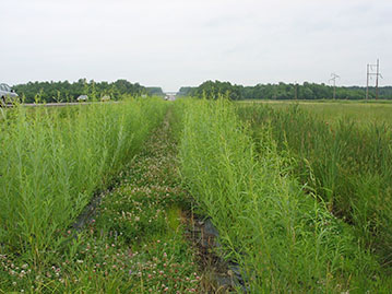 Traditionnellement, on procédait à une tonte systématique à partir du bord de la chaussée sur la plus grande partie de l’emprise routière. Depuis 2004, on favorise une approche où l’entretien est plus ou moins intensif selon les différentes zones du bord de la route (accotement vert, talus, fossé et berge). Seuls les deux premiers mètres à partir de la chaussée sont entretenus de façon plus intensive pour contrôler la prolifération de l’herbe à poux. Dans les cas où le phragmite commun, espèce exotique envahissante, est présent, l’entretien se fait sur 4 à 5 mètres pour des raisons de sécurité. Un projet de recherche en cours avec l’Institut de recherche en biologie végétale (IRBV) vise d’ailleurs à développer une méthode de plantation d’arbustes pour ombrager les fossés et empêcher le phragmite de s’installer. L’entretien est beaucoup moins important dans le reste de l’emprise. Les herbes hautes sur les talus intérieurs permettent de réduire l’éblouissement des usagers la nuit et agissent comme brise-vent.