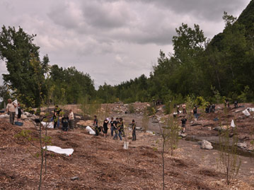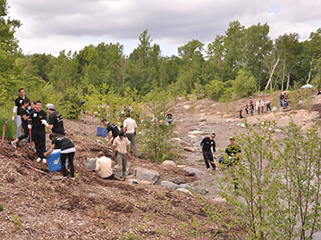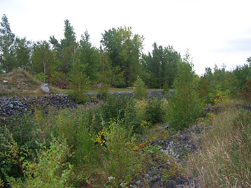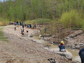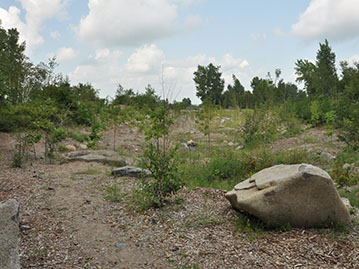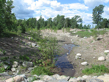 Un ruisseau a été créé au centre de l’aménagement qui remplira son rôle de captation des eaux de ruissèlement et acheminera l’eau vers les égouts municipaux. Ce ruisseau est relié aux milieux naturels adjacents par des seuils et deux mares, une temporaire et l’autre permanente. Les pentes qui ont été adoucies ont été plantées de centaines d’arbres et d’arbustes afin de recréer des bandes riveraines fonctionnelles. Ces travaux ont été possibles surtout grâce au soutien de la communauté (écoles et entreprises) qui a fourni de nombreuses heures de bénévolat pour les plantations et l’entretien des végétaux. Cette diversité d’habitats dans un milieu humide est très favorable à la faune comme à la flore et s’intègre maintenant parfaitement dans le décor du piémont. Enfin, un sentier pour les résidents du secteur a été aménagé afin de leur offrir un contact privilégié avec les milieux naturels du piémont.