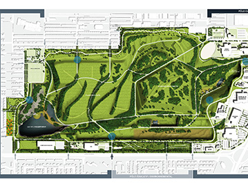 Le plan directeur du CESM, adopté en 1997, définit les principes et thématiques d’aménagement du futur parc. Le concept met en valeur la nature du lieu, l’histoire du site et sa transformation dans le temps en misant sur l’influence des 4 éléments – feu, sol, air, eau. Des pôles d’activités, dédiés à la culture, au sport, à l’éducation et aux activités industrielles et commerciales, ceinturent le cœur du parc alors que ce dernier accueille le lac de l’escarpement, la plaine des vents, le boisé des découvertes et l’amphithéâtre. Le défi est de créer un espace vert convivial et sécuritaire sur un site sensible, particulier et en perpétuel mouvement.